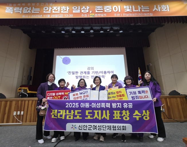 [뉴스앤톡] 신안군여성단체협의회(회장 안미영)가 11월 28일 전남여성가족재단에서 개최된 ‘2025년 여성폭력추방주간 기념행사’에서 여성폭력 방지 유공을 인정받아 전남도지사 표창을 수상하는 영예를 안았다.