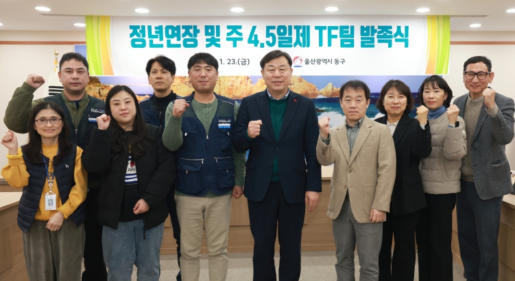 [뉴스앤톡] 울산 동구는 1월 23일 오후 4시 동구청 상황실에서 구청장을 비롯해 자치단체공무직본부 동구지회장, 조합원 등 기관 및 노조 관계자 10명이 참석한 가운데 ‘정년연장 및 주 4.5일제 논의를 위한 TF팀 발족식’을 개최했다.