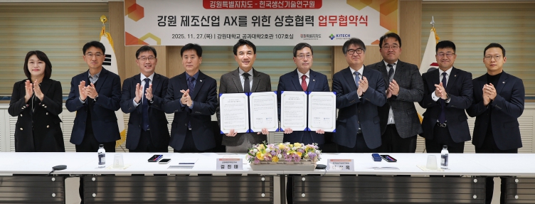 [뉴스앤톡] 강원특별자치도는 11월 27일 오후 3시, 강원 제조산업의 AX(AI Transformation, 인공지능 전환)를 위한 상호 협력을 강화하기 위해 한국생산기술연구원(원장 이상목)과 업무협약(MOU)을 체결했다.