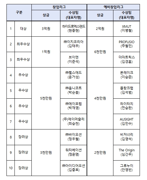 창업 3년 이내 기업이 참가하는 창업리그에서는 하이드로엑스팬드가 대상을 차지하여 상금 3억원을 받았고, 예비창업자가 참가하는 예비창업리그에서는 XMUT(엑스멋)이 대상을 차지하며 상금 2억원을 받았다.