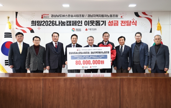 [뉴스앤톡] 경상남도는 29일 도청 소회의실에서 경남버스운송사업조합(이사장 양기환)과 경남지역자동차노동조합(위원장 박지훈)이 도내 취약계층을 돕기 위한 성금 8천만 원을 전달했다고 밝혔다.