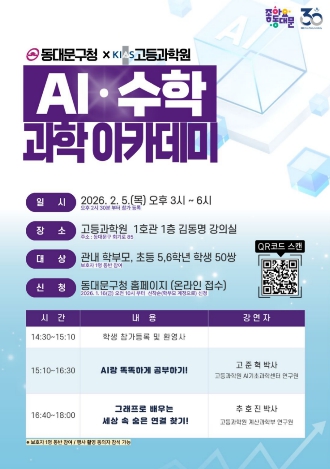 [뉴스앤톡] 서울 동대문구가 겨울방학을 맞아 홍릉에 자리한 고등과학원(KIAS)과 손잡고 ‘AI·수학 과학아카데미’를 연다. 아이 혼자 ‘학원’으로 향하는 대신, 부모와 함께 강연장을 찾아 같은 내용을 듣고 집으로 돌아가는 길에 자연스럽게 대화를 이어가게 하는 ‘가족 소통형’ 프로그램이다.