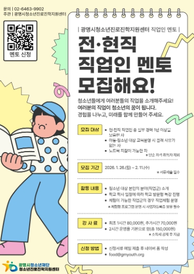 [뉴스앤톡] 광명시청소년재단 청소년진로진학지원센터는 관내 청소년들에게 현실적인 직업 정보와 체계적인 진로 설계 기회를 제공하기 위해 ‘2026년 직업인 멘토’를 신규 모집한다고 밝혔다.