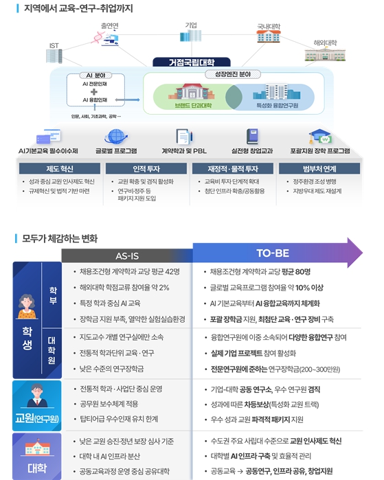 교육부는 올해 3개 거점국립대학을 대상으로 ‘브랜드 단과대학’, ‘인공지능(AI) 거점대학’ 사업을 패키지로 집중 지원하여 교육‧연구의 거점으로 육성한다. 이와 동시에, 전체 거점국립대학의 학부 교육을 혁신하여 전반적인 교육‧연구의 질을 높이고, 거점국립대학과 지역대학이 연계·협력한 공유대학을 통해 지역대학 모두를 동반 성장하도록 지원한다. 이를 위해 올해 3개 거점국립대학에는 작년 대비 교당 약 1,000억 원 내외의 예산을 추가로 지원할 예정이다.