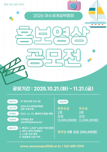 [뉴스앤톡] (재)2026여수세계섬박람회조직위원회가 11월 21일까지 ‘2026여수세계섬박람회 홍보영상 공모전’을 개최한다.