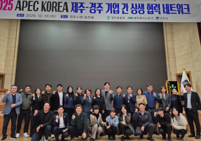 [뉴스앤톡] 제주테크노파크(원장 지영흔, 제주TP)는 지난 28일 경상북도 경주시에서 열린‘2025 APEC(아시아태평양경제협력체)’ 연계 행사에서 경주시 및 사단법인 중소기업융합대구경북연합회 경주융합회(회장 김상헌)와 함께 제주·경주 기업 간 상생 협력 네트워크 회의를 개최했다고 3일 밝혔다.