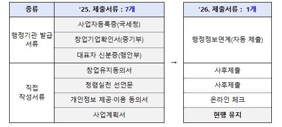 행정정보 연결로 사업자등록증, 재무제표 등 행정서류는 자동수집한다. 개인정보제공동의서 등은 온라인 체크로 대체한다. 또한, 기업 심사에 불필요한 서류는 폐지하거나 선정된 기업만 제출한다. 사업계획서 제한 분량도 평균 14장에서 9.4장까지 30% 이상 감축할 계획이다.