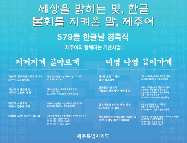 김인영 제주도 특별자치행정국장은 “한글은 우리 민족의 정신이자 문화의 뿌리, 제주어는 소중한 언어문화 유산”이라며 “이번 경축식을 통해 한글의 자부심을 되새기고 사라져가는 제주어에 대한 관심과 실천이 도민 생활 속에 자연스럽게 이어지도록 노력하겠다”고 말했다.