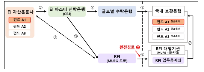 24일 일본 현지의 한 자산운용사는 기존처럼 마스터 신탁은행*(CBJ**)과 글로벌 수탁은행을 통해 결제 정보를 전달하면서도, 원화는 일본 현지의 RFI(MUFG)를 통해 별도로 환전하여, 국내 보관은행에 환전대금을 직접 송금하는 형태의 제3자 환전 시범거래에 성공했다.