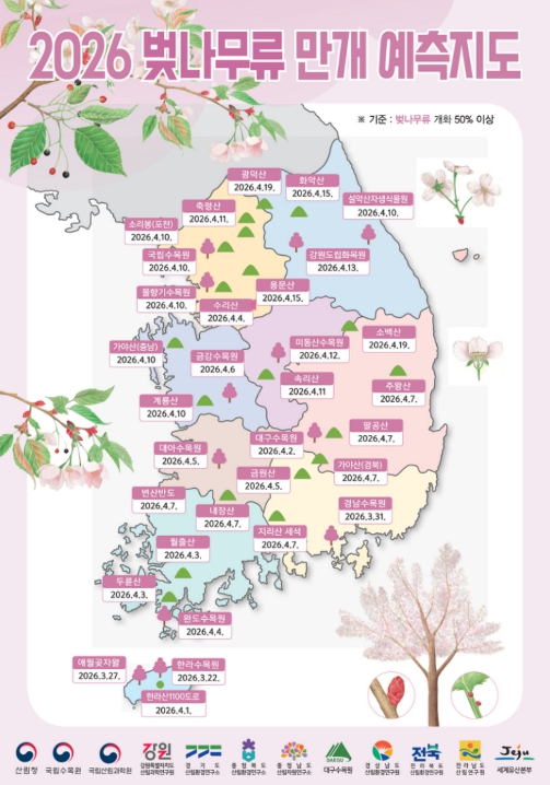 이번 개화 예측은 국립수목원과 9개 공립수목원이 전국 32개 지점에서 관찰한 식물계절현상 자료를 기반으로, 국립산림과학원의 산악 기상정보를 연계·분석해 도출한 결과이다.