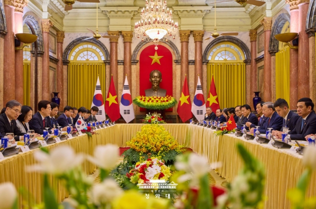 [뉴스앤톡] 베트남을 국빈 방문 중인 이재명 대통령은 22일(현지시간) 오후 베트남 국가주석궁에서 또 럼 당서기장 겸 국가주석과 정상회담을 갖고, 양국 간 포괄적 전략 동반자 관계 발전 방안과 지역·국제 정세 등에 대해 심도 있게 논의했다고 이규연 청와대 홍보소통수석이 서면 브리핑했다.