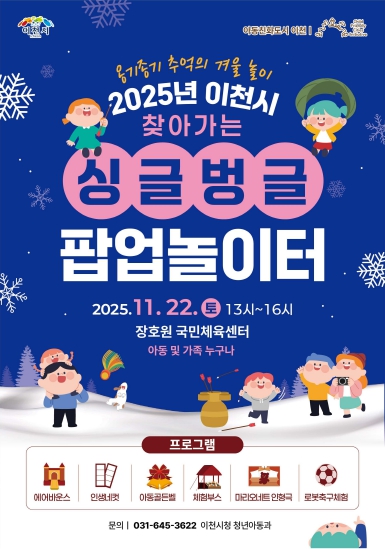 [뉴스앤톡] 이천시는 아동친화도시 놀이문화 확산과 아동의 놀권리 보장을 위해 『찾아가는 싱글벙글 팝업 놀이터‘겨울놀이’』행사를 오는 11월 22일 장호원 국민체육센터에서 개최한다고 밝혔다.