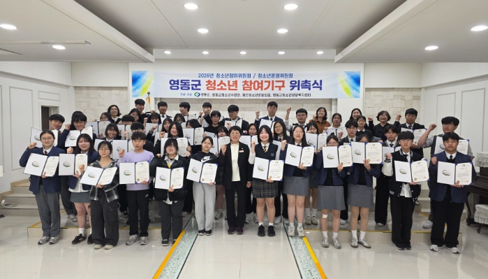 [뉴스앤톡] 충북 영동군은 27일 영동군 여성회관 예식장에서 관내 청소년들의 권익 증진과 정책 참여를 이끌 ‘2026년 영동군 청소년 참여기구 위촉식 및 간담회’를 개최했다.