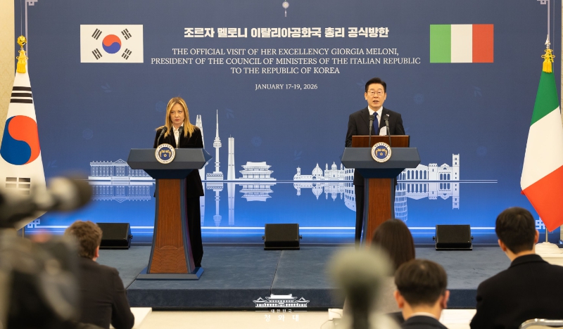 [뉴스앤톡] 이재명 대통령은 19일 조르자 멜로니 이탈리아 총리와의 정상회담 뒤 "저와 멜로니 총리는 전략적 동반자 명칭에 부합하는 미래지향적 수준으로 양국 관계를 더욱 발전시켜 나가기로 합의했다"고 밝혔다.