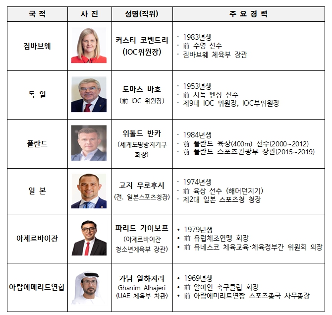 어제(2일)는 총회 개회식에 참석한 ▲커스티 코벤트리(Kirsty Leigh Coventry) 국제올림픽위원회(IOC) 위원장 ▲토마스 바흐(Thomas Bach) 전(前) 국제올림픽위원회(IOC) 위원장 ▲위톨드 반카(Witold Banka) 세계도핑방지기구 회장 ▲고지 무로후시(Koji Murofushi) 전(前) 일본 스포츠청장 등과 만남을 가졌다.