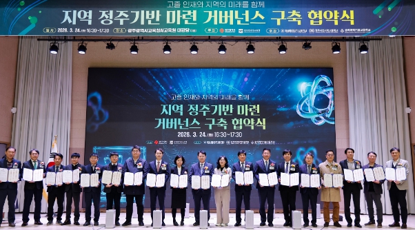 [뉴스앤톡] 광주시교육청과 광주시는 24일 광주AI교육원 대강당에서 이정선 광주시교육감, 김기숙 광주시 교육청년국장 등이 참석한 가운데 ‘고졸 인재와 지역의 미래를 함께, 지역 정주기반 마련 거버넌스 구축 협약식’을 개최했다.