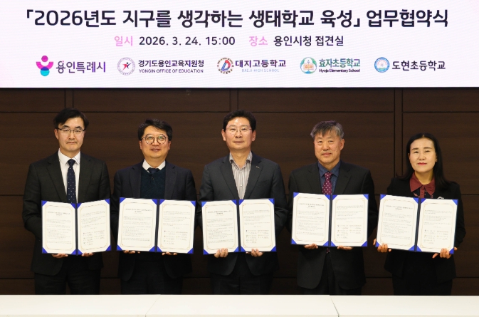 [뉴스앤톡] 용인특례시는 24일 시청 접견실에서 용인교육지원청을 비롯해 3개 학교와 ‘지구를 생각하는 생태학교 육성사업’을 위한 협약을 맺었다.
