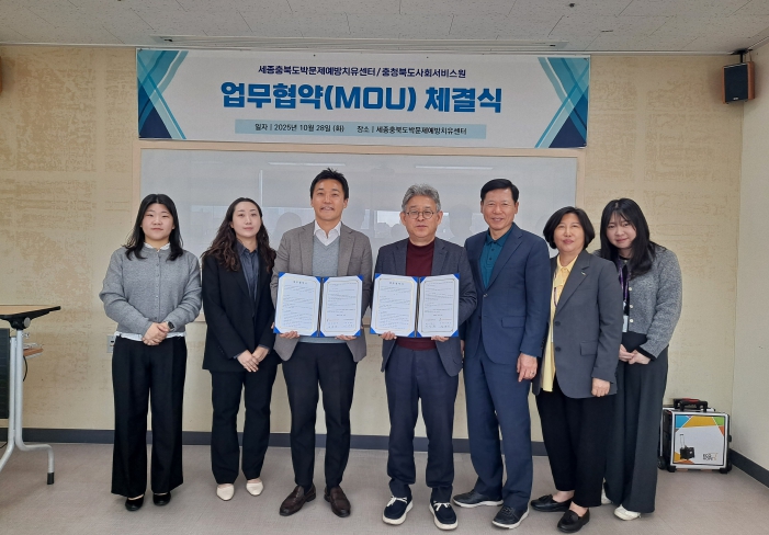 [뉴스앤톡] 충청북도사회서비스원(원장 이장희)과 세종충북도박문제예방치유센터(센터장 김경진)는 2025년 10월 28일 오전 11시, 세종충북도박문제예방치유센터 회의실에서 도민의 정신건강 증진 및 삶의 질 향상과 사회서비스 협력체계 강화를 위한 업무협약(MOU)을 체결했다.