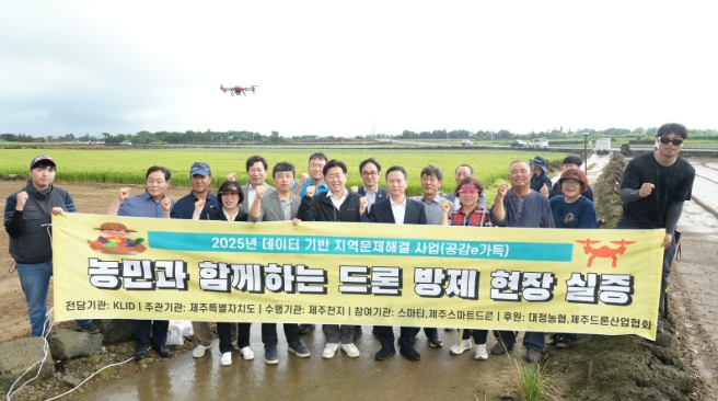 현장에는 오영훈 제주도지사가 직접 참여해 농민들과 함께 드론 방제 시연을 지켜보고 의견을 나눴다. 박덕수 한국지역정보개발원장을 비롯해 사업 수행기관인 농업회사법인 천지, 스마티, 스마트드론협동조합과 대정농협 조합장을 단장으로 한 지역 농민 중심의 ‘스스로해결단’도 함께해 현장의 목소리를 전하고 사업 성과와 애로사항을 논의했다.