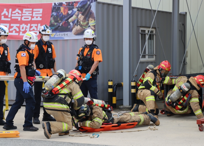 [뉴스앤톡] 나주소방서는 29일 3M나주 공장에서 지자체, 경찰, 군부대, 관계기관 등이 참여한 가운데 긴급구조 종합훈련을 실시했다.