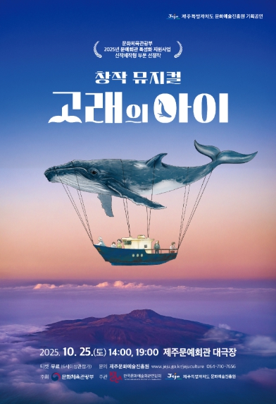 [뉴스앤톡] 제주특별자치도 문화예술진흥원이 한국문화예술회관연합회 주관 ‘2025년 문예회관 특성화 지원 사업 신작제작형’ 공모에 선정된 창작뮤지컬 ‘고래의 아이’를 오는 10월 25일 문예회관 대극장에서 선보인다.