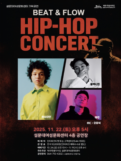 [뉴스앤톡] 제주특별자치도 설문대여성문화센터는 ‘설문대 문화의 날’ 11월 기획공연으로 ‘원슈타인·블랙나인·마린 힙합콘서트’를 11월 22일 오후 5시에 공연장에서 선보인다고 밝혔다.
