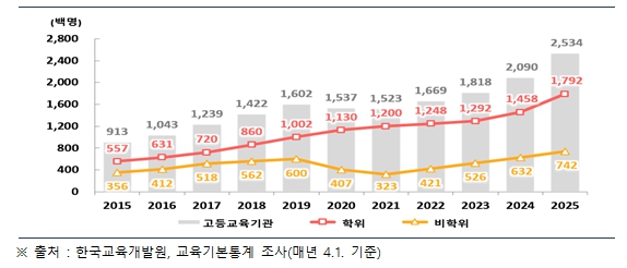 이러한 노력으로 전체 2025년 외국인 유학생 수는 25.3만 명으로 2024년 대비 21.3% 증가했다. 이 중 학위과정 유학생은 전체의 70.7%로 확대됐고, 특히 학위과정 내 이공계 전공의 유학생 비율이 증가했다.