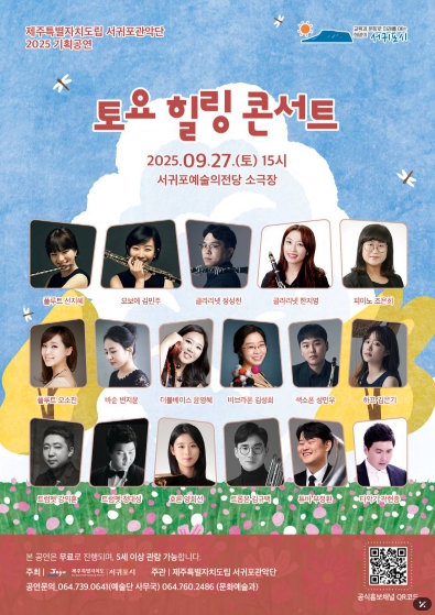 [뉴스앤톡] 서귀포시는 오는 9월 27일 15시 서귀포예술의전당 소극장에서 서귀포관악단의 기획공연 '토요힐링콘서트'를 진행한다.