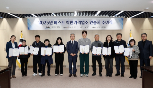 [뉴스앤톡] 제주특별자치도는 도내 최초로 ‘2025년 베스트 착한가격업소’ 15개소를 선정하고 21일 인증서 수여식을 개최했다.