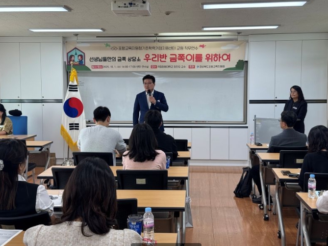 [뉴스앤톡] 포항교육지원청기초학력거점지원센터는 10월 1일 14:00 포항기초학력거점지원센터 4층 연수실에서 정서적 문제로 인해 학습 부진이 누적되고 있는 학생 지도에 어려움을 겪고 있는 포항지역 초등교사 40명을 대상으로 2025 포항교육지원청기초학력거점지원센터 교원 직무연수를 실시했다.