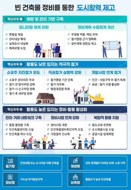 이에, 국토부는 ➊예방 및 관리 기반 구축, ➋활용도 낮은 빈 건축물의 적극적 철거, ➌활용도 높은 빈 건축물의 정비·활용 활성화 등 빈 건축물의 입체적 정비방안을 마련했다.