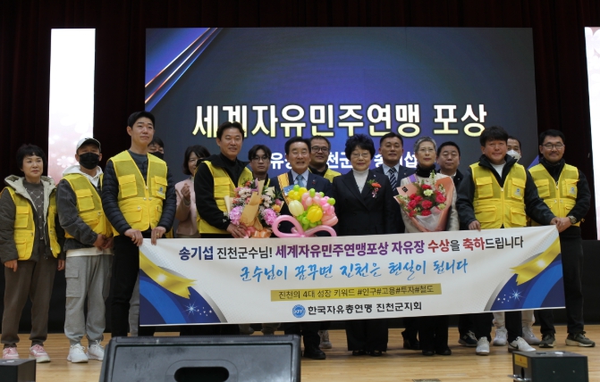 송기섭 군수는 수상 소감에서 “자유민주주의는 우리 사회의 근간이자 미래 세대를 위한 핵심 가치”라며 “앞으로도 진천군이 평화와 번영의 중심 도시로 성장할 수 있도록 더욱 노력하겠다”고 밝혔다.