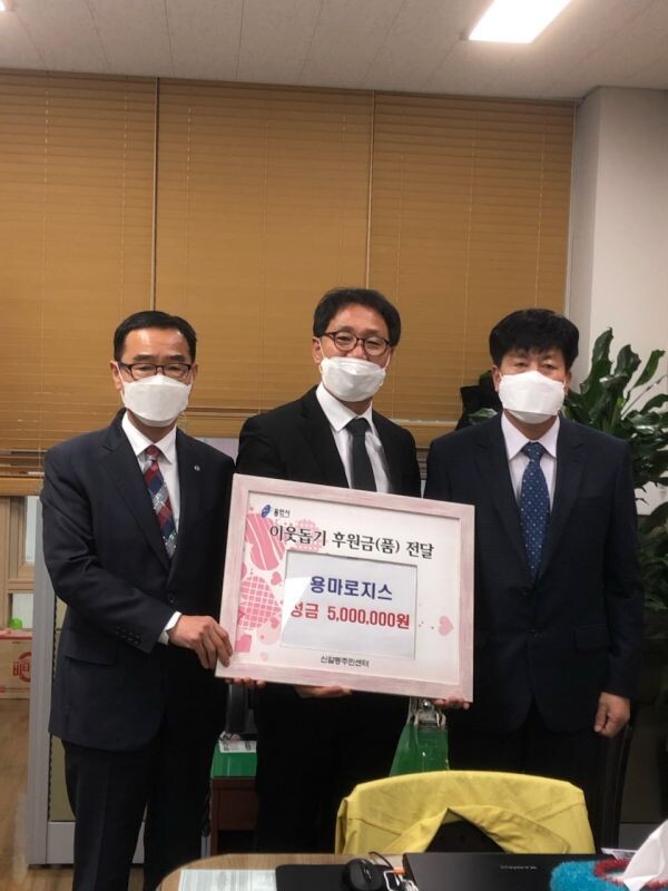 이날 기흥구 신갈동에선 용마로지스가 생계가 어려운 저소득 이웃에게 전해달라며 성금 500만원을 기탁했다.