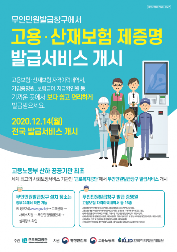 근로복지공단과 행정안전부는 근로자와 사업주가 더 손쉽게 고용·산재보험 증명서를 발급받을 수 있도록 전국 지방자치단체에서 운영하는 무인민원발급기를 통해 16종의 증명서를 12월 14일부터 무료로 발급하는 서비스를 개시한다고 밝혔다.