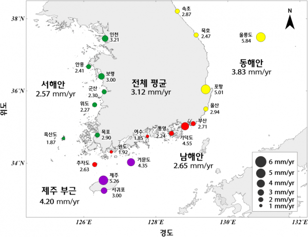 관측지점별로 보면 울릉도가 연 5.84mm로 가장 높았으며 이어 제주, 포항, 가덕도, 거문도 순이었다.