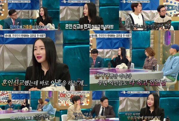 혼인신고 이틀 뒤 한 언론에서 낸시랭이 몰랐던 전 남편의 이야기를 보도했던 것. 이에 MC 김구라는 “언론에서 터뜨리기 전에 주변에서도 얘기하는 사람이 있었느냐”고 물었고 낸시랭은 “주변 모두가 똑같이 속고 있었다”고 말해 시선을 강탈했다.