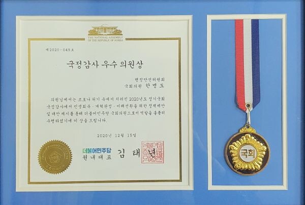 한 의원은 “코로나19로 어려운 상황에서도 국정감사 본연의 기능과 역할에 충실하기 위해 노력했는데 이 점을 당에서 높게 평가해준 것 같아 기쁘다”며 “국정감사에서 지적한 내용들이 충실히 이행되는지 끝까지 책임감을 가지고 챙기겠다”고 수상소감을 밝혔다.