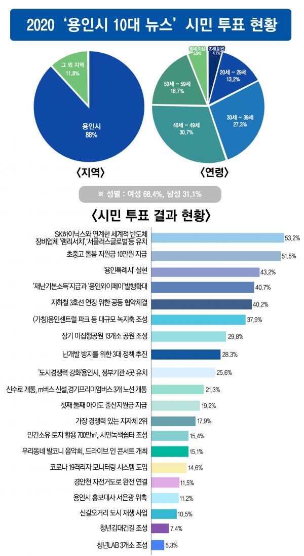시민들이 선정한 가장 중요한 뉴스로는 반도체 허브도시 조성과 일자리 창출을 위한 SK하이닉스와 연계한 세계적 반도체 장비업체 ‘램리서치’,‘서플러스글로벌’유치 였으며 전국 최초 초·중·고 돌봄지원금 지급 , ‘용인특례시’실현 , ‘재난기본소득’지급과‘용인와이페이’발행 확대 , 지하철 3호선 연장을 위한 공동 협약체결이 뒤를 이었다.