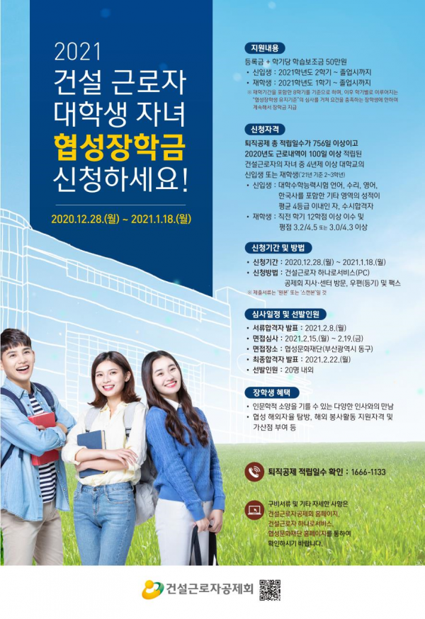 공제회 관계자는 “코로나9로 어려움을 겪는 건설근로자 및 대학생 자녀에게 장학생 선발 안내가 반가운 소식이 될 것”이라며 “많은 학생들이 협성장학생 선발에 관심을 갖고 지원해 주길 바라며 공제회와 재단의 장학 사업을 통해 훌륭한 인재로 성장할 수 있게 되길 바란다”고 밝혔다.
