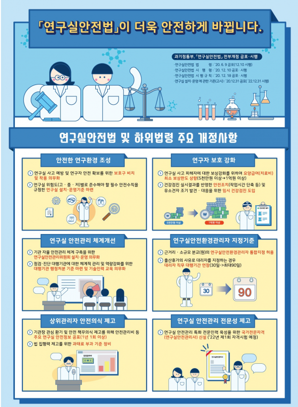 연구실 내 보호구 비치 및 착용을 의무화하고 연구실 설치·운영 기준을 마련해 연구실 위험도별로 준수해야 할 필수 안전수칙을 규정함으로써 안심하고 연구할 수 있는 연구실 환경을 구축하도록 했다.