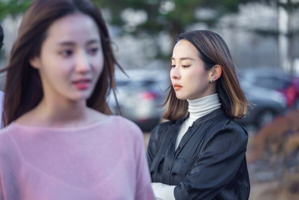여주의 존재를 의식하지 못한 듯 스쳐 지나는 미래와 그녀의 곁에서 딱딱하게 굳은 표정으로 꼼짝 않고 서 있는 여주의 모습이 담긴 투샷은 보는 이들까지 긴장하게 만든다.