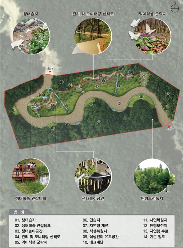 이와 관련 시는 임도 주변 비탈면 등 1만5000㎡ 규모의 애호랑나비 서식지를 복원하고 시민들이 자연학습장으로 활용하도록 건습지와 생태탐방로 등 생태숲을 조성하게 된다.