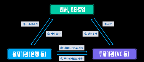 융자기관 입장에서는 후속투자 가능성이 높은 기업에게 융자를 해줘 회수 가능성을 높이고 아울러 지분인수권을 통해 기업이 성장했을 때 금리보다 높은 수익을 얻을 수 있다.