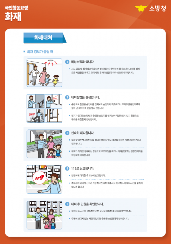 아울러 짧은 시간 안에 신속한 대피를 위해서는 화재감지기와 비상벨 등 소방시설이 제 기능을 발휘하도록 관리하고 방화문은 꼭 닫아두어야 한다.