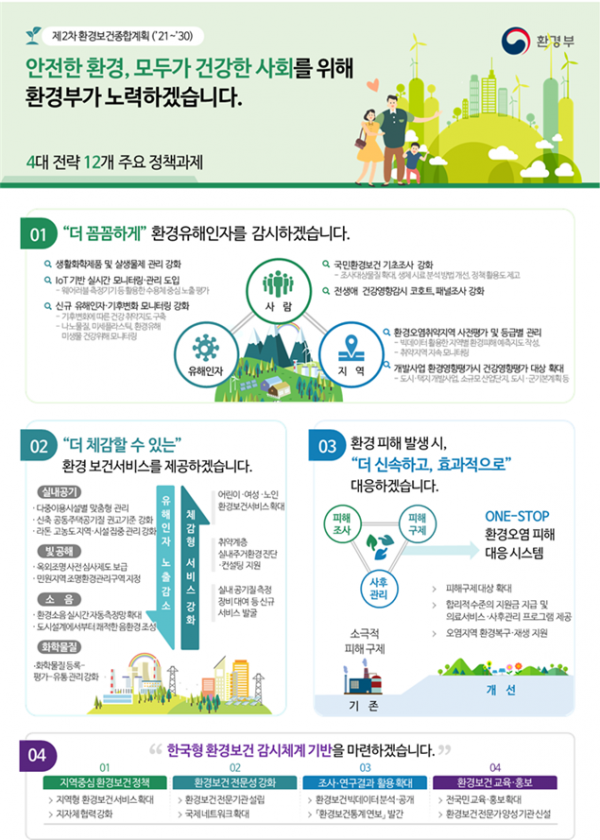 이번 종합계획은 한국형 환경보건 감시체계 구축을 위해 환경유해인자의 사전 감시 강화, 노출 관리 강화, 환경성 건강피해 대응 능력 강화, 환경보건시스템 견고화라는 4개의 전략과 세부과제로 구성됐다.