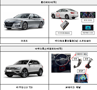 첫째, 혼다코리아㈜에서 수입, 판매한 어코드 11,609대는 바디컨트롤모듈의 소프트웨어 오류로 계기판의 각종 경고등이 오작동하고 후진 시 후방 카메라가 작동되지 않을 가능성이 확인됐다.
