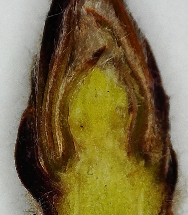이어 채취한 눈을 날카로운 칼로 세로로 이등분하고 확대경을 이용해 꽃눈인지 잎눈인지 확인한다.