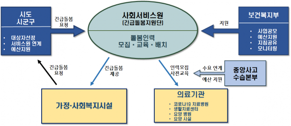 이 사업은 사회서비스원이 요양보호사와 간병인 등 돌봄 인력을 모집해, 밀접 신체수발과 코로나19 방역수칙에 대한 사전 교육을 실시하고 중수본은 사회서비스원이 모집한 돌봄 인력을 의료기관과 요양 시설에 계신 고령확진자·장애인 등 돌봄이 필요한 대상에게 파견해, 코로나19 치료병원 등에서 의료진이 돌봄 걱정 없이 고령 및 장애인 확진자에 대한 치료에 집중할 수 있는 환경을 조성하는데 기여할 것으로 기대된다.