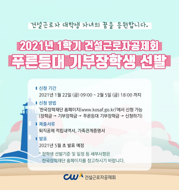 공제회가 2014년부터 시행 중인 ‘건설근로자 자녀 장학사업’은 그동안 2,420명의 장학생을 선정해 총 24억 6천만원의 장학금을 지급했으며 지난해부터 한국장학재단의 ‘푸른등대 기부장학사업’을 통해 장학생을 선발하고 있다.