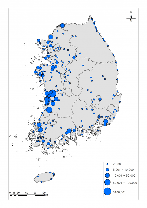 이는 최근 기온 급강하로 인해 기존 서식지의 먹이자원이 소진되면서 소규모 무리로 분산되어 조사지역을 벗어나거나 중국 남부 등 국외로 이동했을 것으로 추정하고 있다.